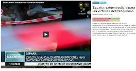 Otro vídeo del programa de TeleSur dedicado al franquismo. Son como cinco minutos dedicados a los 114.000 asesinados por los fascistas y enterrados en fosas comunes en todo el país. Mi aparición en él es brevísima, pero lo dejo por la importancia del tema en sí y para que quede constancia de quién es quién aquí y ahora. Veamos:
